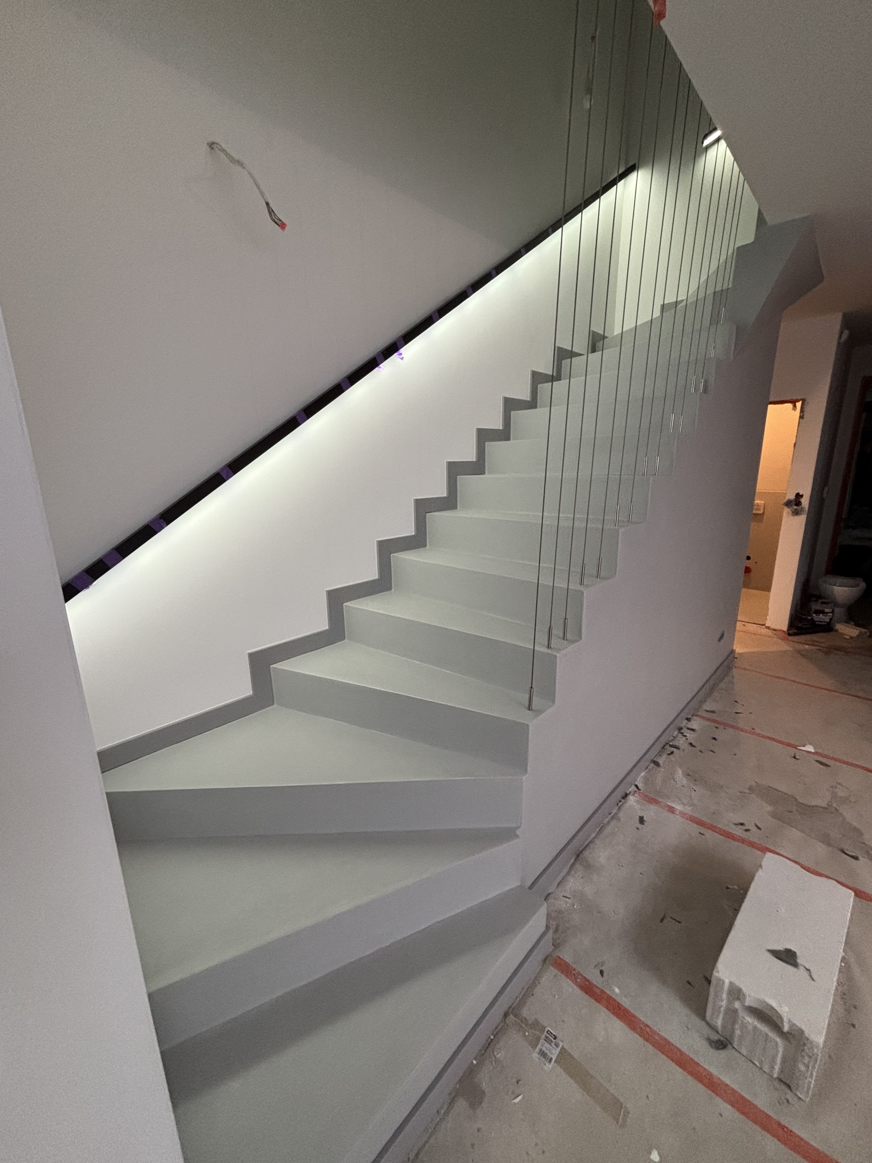 W tej realizacji wykonaliśmy mikrocement w prywatnym wnętrzu w Warszawie. Projekt obejmował kompleksowe wykończenie podłóg, ścian oraz schodów w technologii bezspoinowej, co pozwoliło uzyskać spójny i nowoczesny efekt w całej przestrzeni. Mikrocement doskonale sprawdził się zarówno na posadzkach, jak i na schodach oraz powierzchniach pionowych. Dzięki temu wnętrze zyskało elegancki wygląd betonu architektonicznego, a jednocześnie wysoką trwałość i odporność na codzienne użytkowanie. Bezspoinowa struktura mikrocementu to idealne rozwiązanie do nowoczesnych apartamentów – ułatwia utrzymanie czystości, optycznie powiększa przestrzeń i pozwala na stworzenie jednolitego wykończenia bez fug. Zakres prac obejmował przygotowanie podłoża, aplikację systemu mikrocementowego oraz zabezpieczenie powierzchni profesjonalnym lakierem ochronnym, który zwiększa odporność na ścieranie oraz zabrudzenia. Efekt końcowy to minimalistyczne wnętrze premium, w którym mikrocement stanowi nowoczesną bazę dla designerskiego oświetlenia i wyrazistych kolorów.